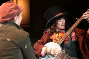 Artful Dodger (actress Staci Stout) sings on the banjo to Oliver (Hallie Walker) in the musical Oliver!, running now through February 25 at the Adrienne Arsht Center in Miami.