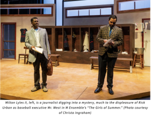 The play’s literal odd man out is Mr. West (Rick Urban), a white baseball executive who refuses to let anything – including the team’s missing coach – ruin what promises to be a huge payday, given the robust advance sales to mostly Black women ticket buyers. He wants to shut down the inquisitive Mr. James pronto, repeatedly mangling the Black reporter’s last name because he’s not really paying attention, even though he knows James poses a threat.