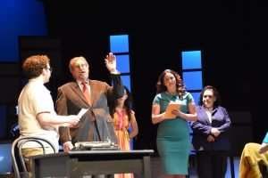 Rachel O’Hara also shines as Gussie. At times, literally. She opens Act II all decked out in a glamorous, sparkly gown for the “Act 2 Opening” number. And Devra Seidel’s Mary showcases her comedic side while also nailing some of the most emotionally wrought lines in the show. Always the woman behind the men, she’s the most sympathetic and sensitive character that may be too starry-eyed for her own good. Her unshakable ideals are on full display when the final songs of Act II bring them back to 1957 where she joins the company in celebrating “Our Time” and “Opening Doors.” Reawakening all the fresh-faced optimism of youth.