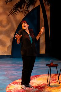 Actress Elena Maria Garcia expresses surprise and anger as one of her characters in “Cuban Chicken Soup”, running now through May 19 at Adrienne Arsht Center for the Performing Arts in Miami. Photo Credit: Morgan Sophia.