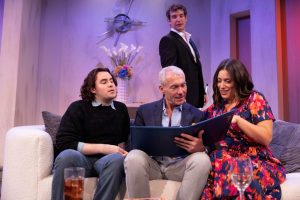 Benjamin (actor Daniel Barrett), Elliot (Steve Schronko) and Jodi (Suzanne Ankrum) look at family photos while Trey (Jeff Brackett) looks on standing up in “Skintight”, running now though June 27 at Island City Stage in Wilton Manors.