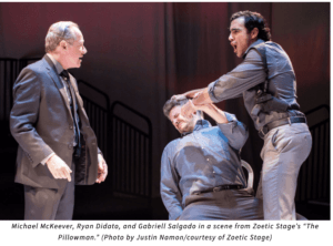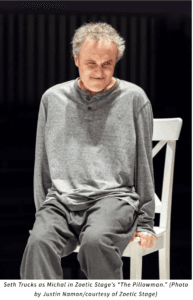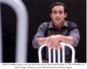 Remember sitting around a campfire listening to ghost stories? For me, it was the pitch black of the forest of the Pocono mountains, each storyteller trying to top the one before them with a yarn even more horrific. Zoetic Stage’s season opener provokes a similar feeling with its in-the-round production of British playwright Martin McDonagh’s “The Pillowman” running through Sunday, Nov. 10 at the Carnival Studio in the Adrienne Arsht Center for the Performing Arts, Miami.