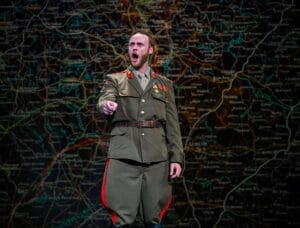The story begins in a similar fashion to the movie with a small slice of life inside the czar’s family. Little Anastasia (Blaire Dimisa) and her grandmother, the Dowager Empress (Laura Turnbull), share that they will always share Paris as a special place between them, and she gifts her a music box that plays the classic “Once Upon a December.” Rebels then appear, rather abruptly, in the form of a red projection, and the czar is then usurped, murdered, and we do not see Anastasia (Mikayla Cohen) until she has grown in some years. The viewer then learns she has lost her memory and is a street sweeper, with no context of her amnesia; she just doesn’t remember. This older version of Anastasia is mostly in distress for the majority of the musical, unlike her joie de vivre version from the film. This created anxiety in me. Also, the antagonist of this musical is not Rasputin, the dark sorcerer who sold his soul for the downfall of the Romanovs, but the future the revolution created in Russia, personified in a new character named Gleb (Sean William Davis). These stark departures, replaced with a more historical and realistic plot, disappointed me.