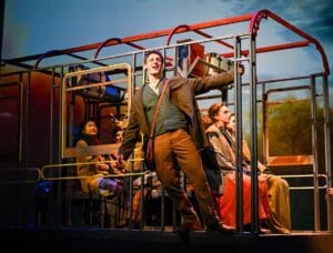 Opening on Saturday, December 21, and running through January 5, “Anastasia the Musical” contains yet another phenomenal set by Slow Burn. Framing the entire set, and increasing levels of depth behind it, neon trapezoid parallelograms reached up to the ceiling, jigsawed against another to run directly across the proscenium, with more jigsawed to the floor. It was a brilliant design. All props to the Scenic Designer, Nikolas Serrano. Coupled with the efforts of the Lighting Designer, Eric Norbury, and the Technical Director, Timothy S. Dickey, along many others I’m sure, I was blown away. The later appearance of an apparatus on wheels that had seats to simulate a moving train (shown in the photos) was also something no less than ingenious. Other constructions like this have appeared in Slow Burn’s recent productions, like “Newsies” and “SpongeBob,” were bigger, but this one was particularly impressive by its importance to the setting and scene.