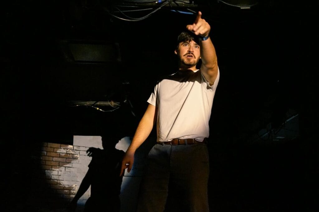 Scene 1 opens to a sparsely furnished, exposed brick alcove above City College’s cafeteria where we see Daniel (Garrett Colon) stretched out ominously on the floor. No, he’s not dead, just asleep, having arrived hours early for a Trotskyist meeting. Finally, the club’s leader, Lev (Samuel Krogh), enters bearing leftover pastrami sandwiches from the local deli which he shares while explaining that their debate get-togethers tend to start at 1 am – “when there’s nothing left to do but argue.”