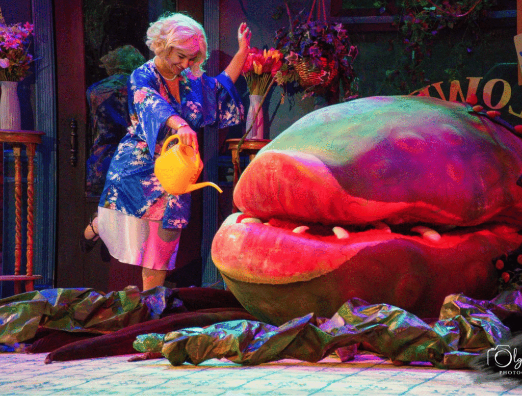 This air of transformation held in the theater like a miasma. One could feel that the theater has begun to take a serious step to becoming a professional company with its rotating crew of talent, which feels like a bit more than a community theater. The community is still embraced but as their competence remains steady and their dedication to the art form remains pure, it’s not hard to imagine the if-but-when. And for a show Little Shop, the talent goes so far beyond the cast that takes up space on stage. We have to recognize the Technical Director Marty Mets, the Shop Foreman Bryan Wohlust, and the Lead Carpenter Ma Knoke. The Stage Managers, the Set Designer, the Scenic Painters, and the remaining carpenters deserve increasing respect. This set… wow.