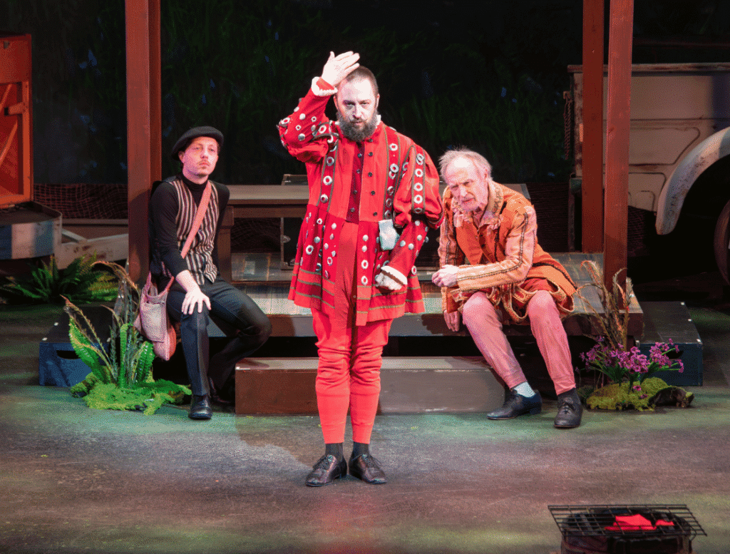 But at least in our case, it was worth enacting this ludicrous plot to be entertained by a traveling “Shakespearean” mini-troupe of fools and their over-the-top skits. The self-styled leader and “teacher” of this two-man company – a long-in-the-tooth, memory-challenged actor whose Elizabethan outfit was literally coming apart at the seams, was played to comedic perfection by Kevin Reilley as Henry. His sole student/follower, a “death scene” specialist who vividly and repeatedly illustrates his special talent at dramatically extending the last throes of life – all while clothed in impressive doublet attire – was delightfully portrayed by outrageous cutup Darryl J. Willis as Mortimer. (Props to Kimberly Wick for her costume design expertise, both here and throughout the show.)