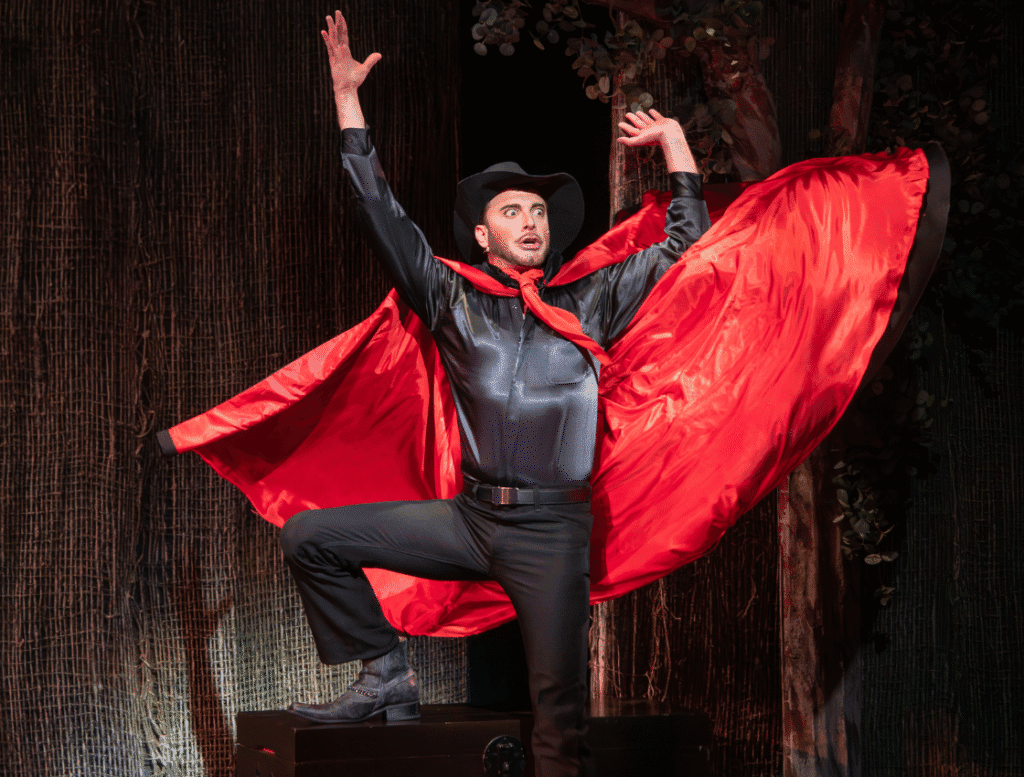 As if this scenery weren’t enough to bring us to attention, we’re immediately greeted by the one-of-kind powerful voice and vocals of our Narrator cum El Gallo, Jesse Luttrell, who I could listen to with pleasure forever. The critics call his singing “dazzling” and say he’s blessed with “a big velvety voice,” one his voice teacher considers a rare Heldentenor – a tenor who sounds like a baritone. In addition to musical theater, Luttrell’s a popular international star of nightclubs and cabarets, which might explain his easy sex appeal. And why he was the ideal casting choice to play a devilish rogue who dominates every scene he’s in … and there are many. Starting with when our lean, lead singer/narrator, dressed all in black, ties his signature red scarf around his neck and belts out bittersweet “Try to Remember” (the show’s signature song in a version you’ll never forget).