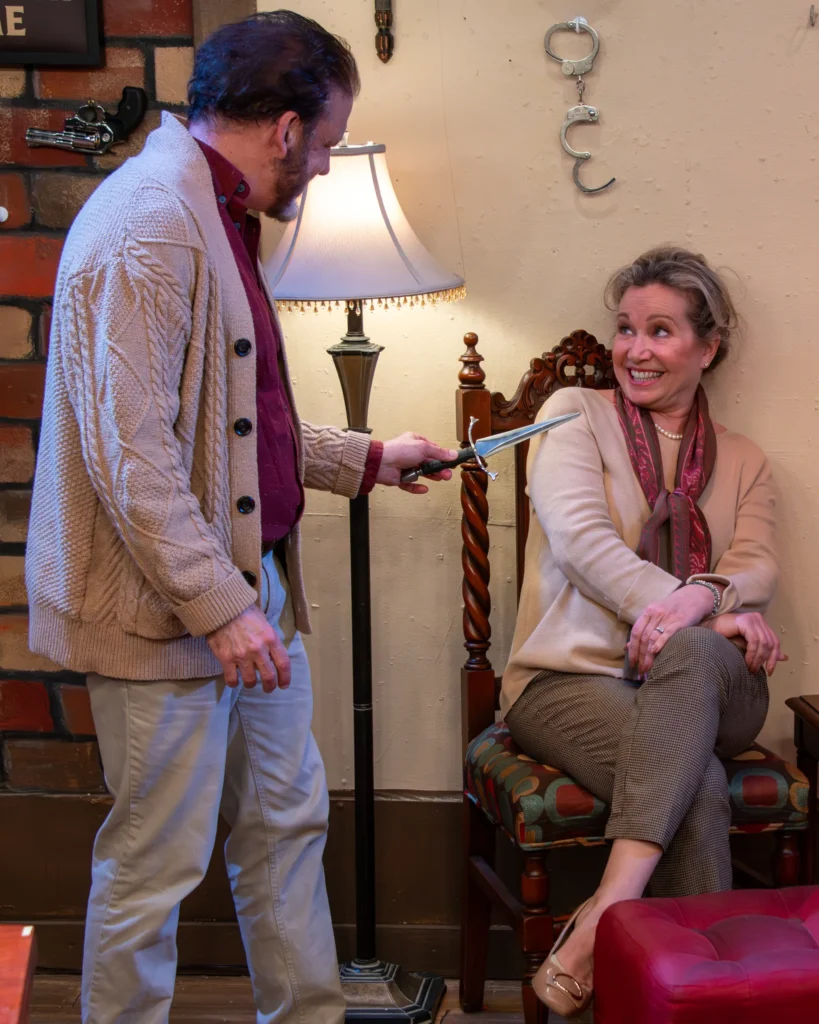 Opposite him, Om Jae brings a mesmerizing blend of charm and danger to Clifford Anderson. At first, Clifford seems like the eager young writer, all gratitude and bright-eyed enthusiasm, humbled to be mentored by his idol. But Jae plays the part with subtle mischief, letting the cracks form slowly until we’re no longer sure who’s teaching whom. As the tension thickens, Clifford’s smile becomes a mask, his admiration a provocation. Jae captures the script’s most delicious irony—that Deathtrap itself becomes the deathtrap, the written work that consumes its creators. He handles the physicality and pacing of the role with sharp, feline precision; his energy ricochets beautifully against Buzzeo’s measured restraint. (Jae also served as the play’s Fight Director. Certified in all weapons and firearms training, his skills were often on display.)
