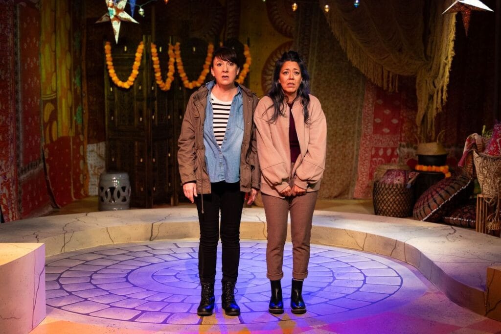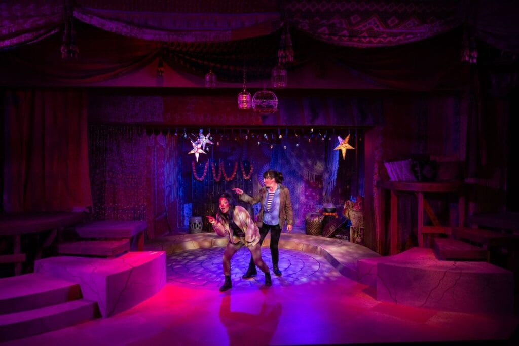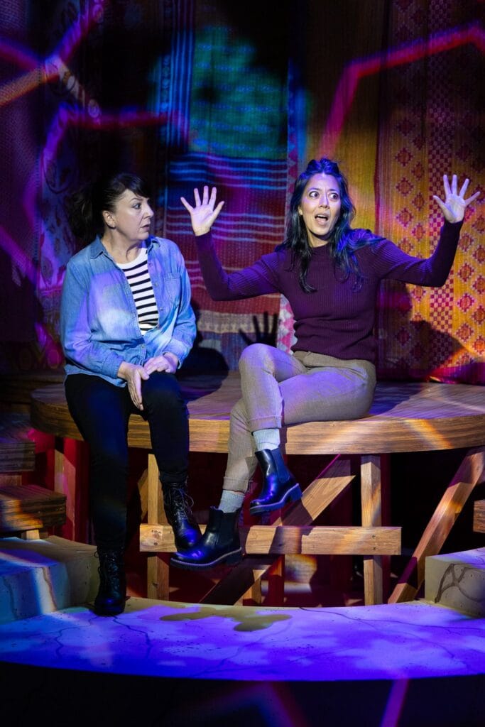 Niki Fridh and Vaishnavi Sharma don’t only appear in their primary roles of Laura (Tess’s pretend mother) and Tess (Laura’s daughter on a mission to retrieve a package left by her estranged father), they also perform lightning-fast switches into 30 distinct characters. And we easily follow and believe – their physical agility and theatrical sleight-of-hand is that perfect! In Mastavia, they are both everyone and everywhere all at once, or as Fridh reflects, “The play is about kismet, adventure, and unexpected connection. With Sharma adding, “Stories are the lifeblood of how we communicate.”