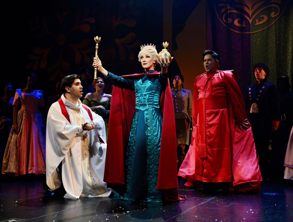 Anna, now played by Kristi Rose Mills, is as independent and feisty as ever with a bit of a twang in her voice (was she channeling Annie Get Your Gun?). She trips and falls over Hans (Milo Alosi), literally and figuratively, who’s “Hans of the Southern Isles,” 13th son of a king, acting completely smitten with Anna. As she is with him, and this fools us as well for isn’t “love at first sight” a perfectly acceptable fairytale motif? It’s finally Coronation Day for her sister Elsa who’s come of age (their parents were lost at sea when they took off in search of a cure for Elsa’s dangerous “condition”). But practical Elsa refuses to give her blessing for a quickie wedding after knowing the guy for only a day.