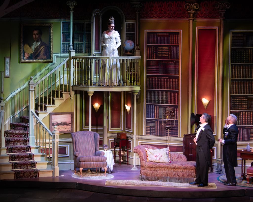 Brady Ryan Phillips, in another Wick debut, played Freddy for the second time, perfectly, and I couldn’t help rooting for the poor lovestruck lad as he sat swooning for Eliza while singing the patient lover’s anthem, “On The Street Where You Live.” One more Wick regular who fooled me by portraying her new role so completely was Britte Hammeke as chief housekeeper Mrs. Pearce. Her always impressive voice joins “The Servants’ Chorus,” Eliza and two maids in “I Could Have Danced All Night,” and later the gloating Higgins and Pickering in “You Did It.”