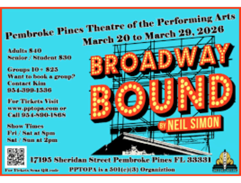 Overall, Broadway Bound was a credit to the founders of PPTOPA. They had a belief that theater could shine in west Pembroke Pines and it does. Though not perfect, Broadway Bound did contain moments of brilliance. Neil Simon had plenty to say in Broadway Bound with its themes of growth, separation, old age and infidelity. Past PPTOPA productions with professional actors have given other professional venues a run for their money. You are encouraged to check out the next PPTOPA production in the fall.