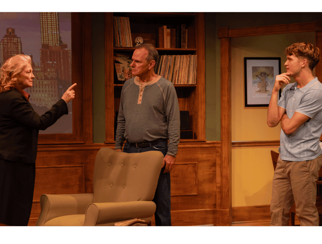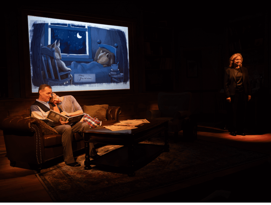 Personally, I’m glad we got to attend its second run here in South Florida because I believe under Linser’s exquisite direction and the perfect casting of two award-winning, highly accomplished local stars (Laura Turnbull, Christopher Dreeson) and a young, up-and-coming one who more than holds his own (Aidan Paul), we are blessed by the best possible production. Especially considering the clever addition of a “fourth character” in endearing, full-color projections of picture-book pages by award-winning, Miami-based illustrator Bong Redila. The pages tell the ongoing stories of “Chipmunk and Squirrell” while Dreeson and Paul enact the dialog in cute, character voices.